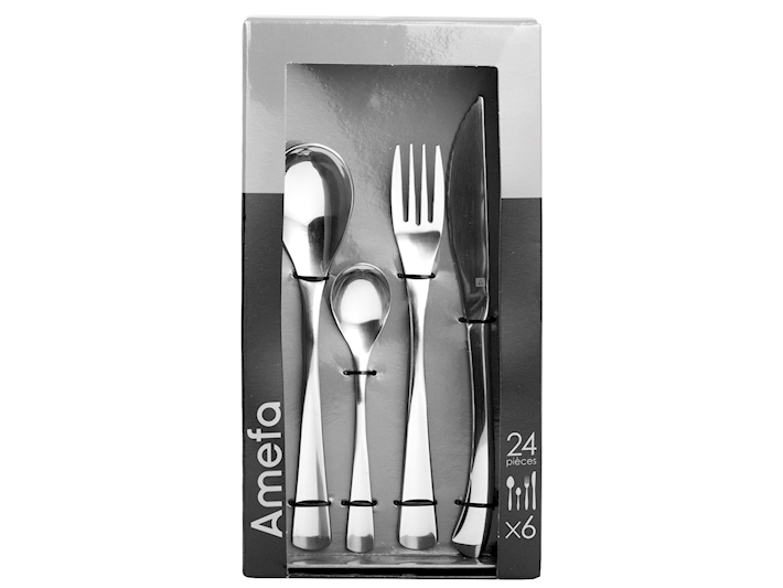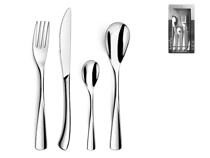Servizio posate 16 pezzi vision. composto da: 4 cucchiai tavola, 4 forchette tavola, 4 coltelli tavola, 4 cucchiaini caffe’. idoneo al lavaggio in lavastoviglie. Colore Grigio Materiale Acciaio Inox