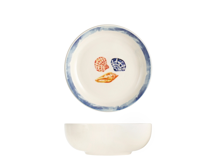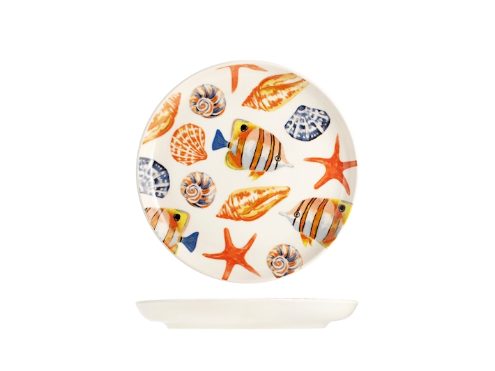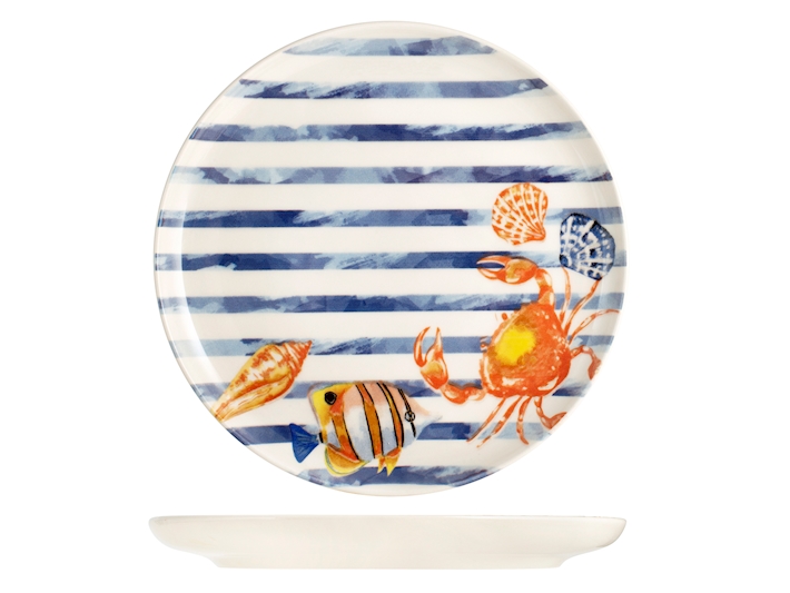 Sevizio 18 pezzi tavola playa in stoneware decorato . composto da 6 piatti piani cm 26, 6 piatti fondi cm 17, 6 piatti frutta cm 20. idoneo al lavaggio in lavastoviglie e all’uso in forno a microonde