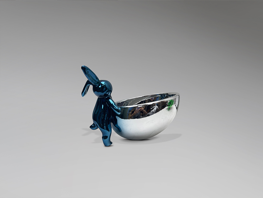 Ciotola e coniglietto, figure in resina di piccolo formato, con finitura in colore metallizzato blu e argento. SCHULLER