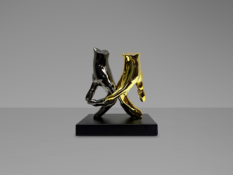 Figura in resina che rappresenta due mani di piccolo formato, rifinita in colore metallizzato grigio piombo e dorato. Dimensioni: Peso: ↔ 18,0 ↨ 20,0 14,0 cm 1,3 Kg