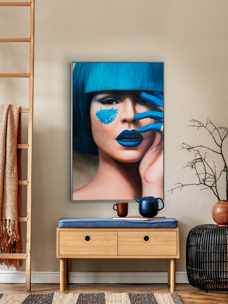 Stampa di volto femminile su tela. Cornice rifinita in color nero satinato e argento.