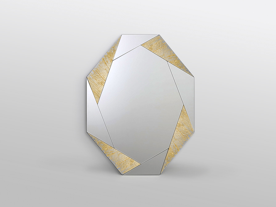 Specchio a superfici bisellate e decorazioni grafiche in LAMINA D’ORO. Parte posteriore in fibra nera. Collocabile in posizione orizzontale o verticale.