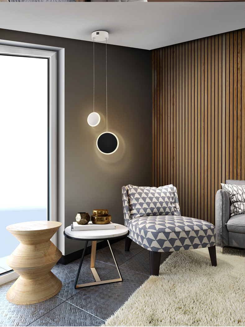 Lampada a sospesione formata da due dischi metallici a luce perimetrale, in tono opaco,