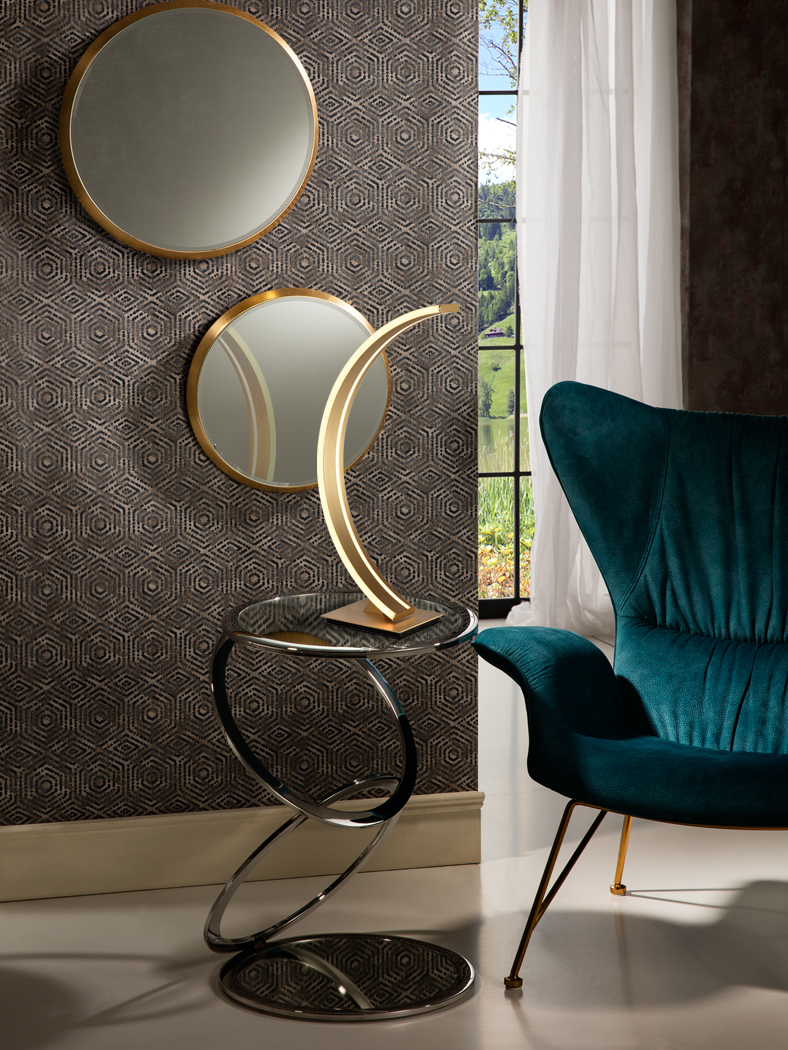 Lampada da tavolo a luce LED in metallo e alluminio rifinito in oro spazzolato.