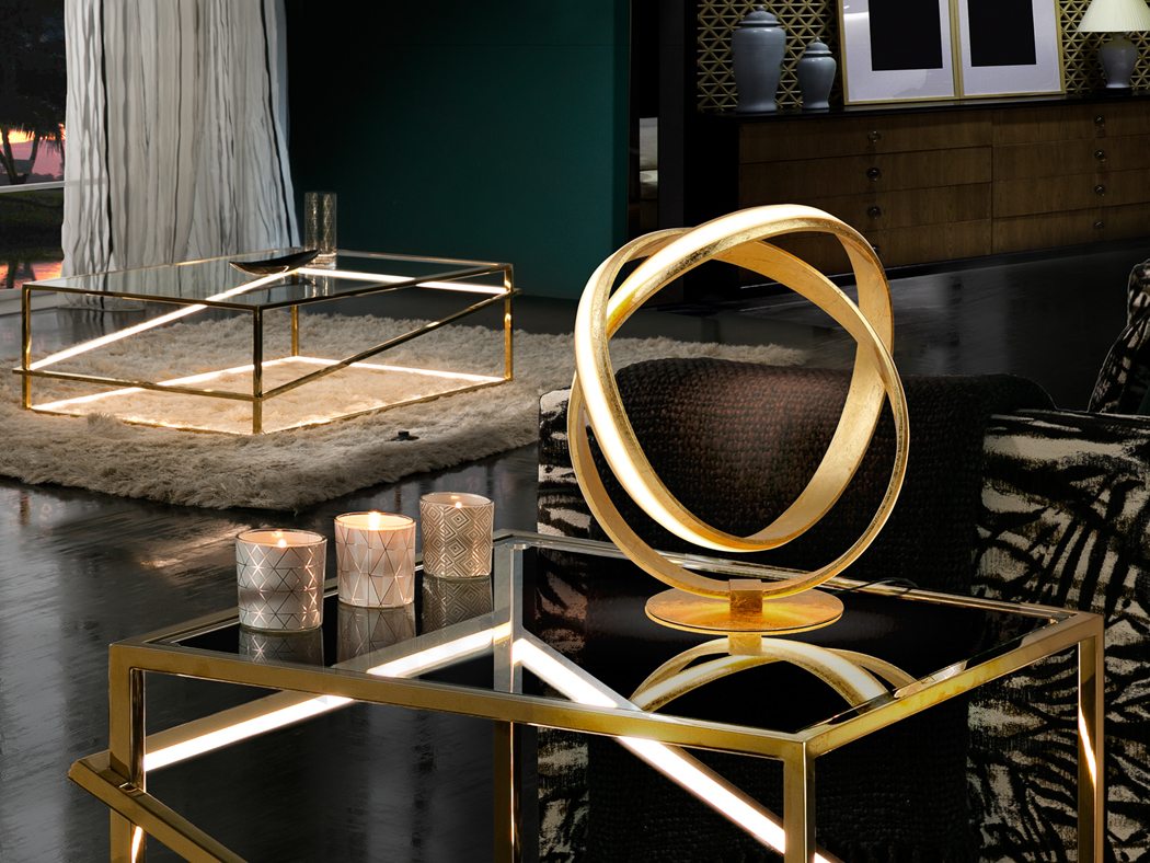 Lampada da tavolo in acciaio e alluminio, rifinita in LAMINA D’ORO.