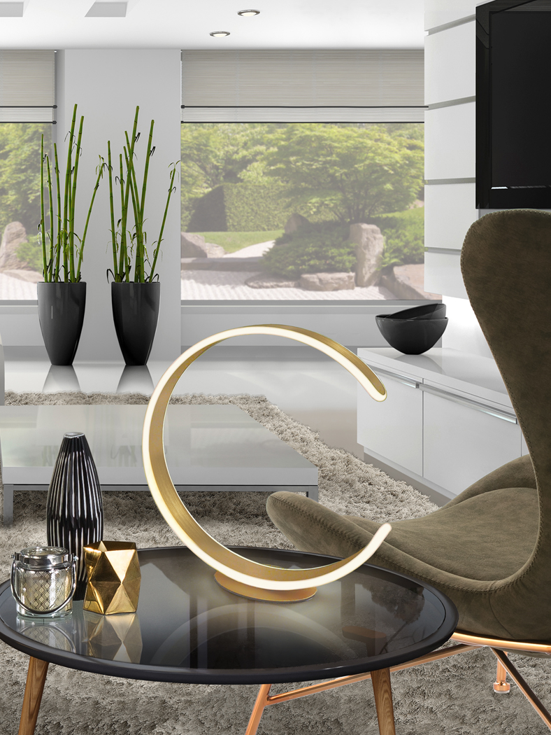 Lampada da tavolo in alluminio spazzolato e acciaio rifinito in color oro opaco.