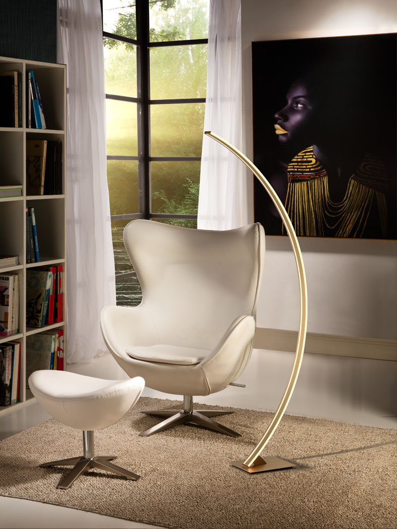 Piantana a luce LED in metallo e alluminio rifinito in oro spazzolato. Diffusore in silicone opalescente. 38W LED, 1.800 lumen, 3.000 K. TEMPI DI CONSEGNA 15-30GG CODICE:8435435327316