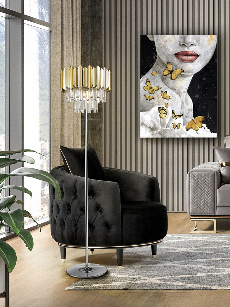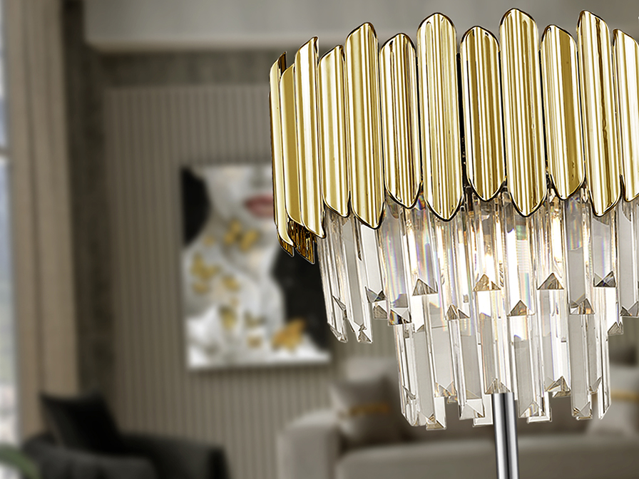 Piantana in metallo cromato. Paralume formato da prismi di vetro sfaccettato sormontati da abbellimenti in ABS dorato. QUESTO ARTICOLO INCLUDE 3 G9 LED 6W CODICE: 8435435336851 TEMPI DI CONSEGNA 15-30GG