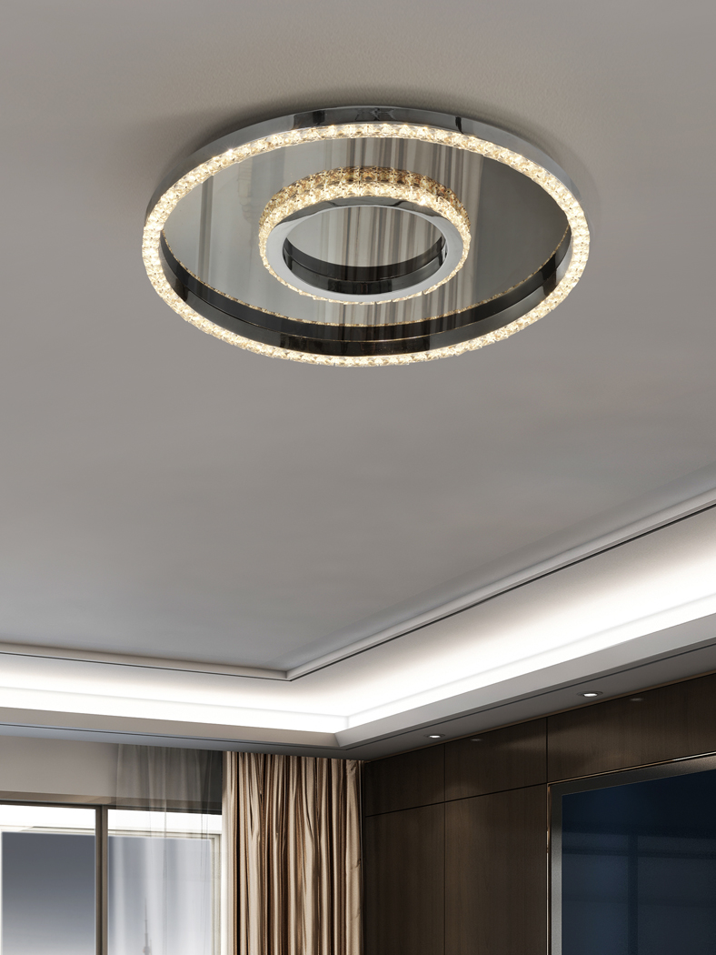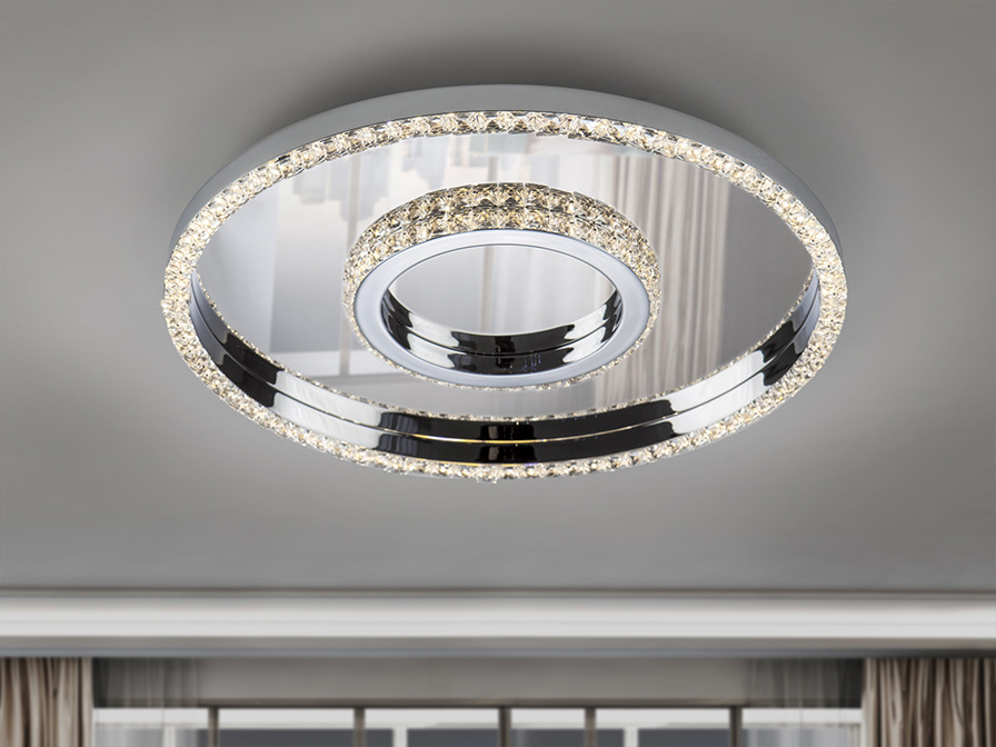 Plafoniera in acciaio e alluminio cromato.