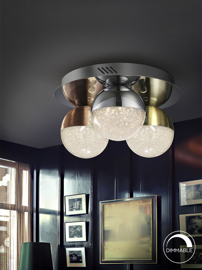 rifinito in rame satinato, ottone satinato e cromo. 14,4W LED, 3.000K, 1.000 lm. DIMMERABILE.