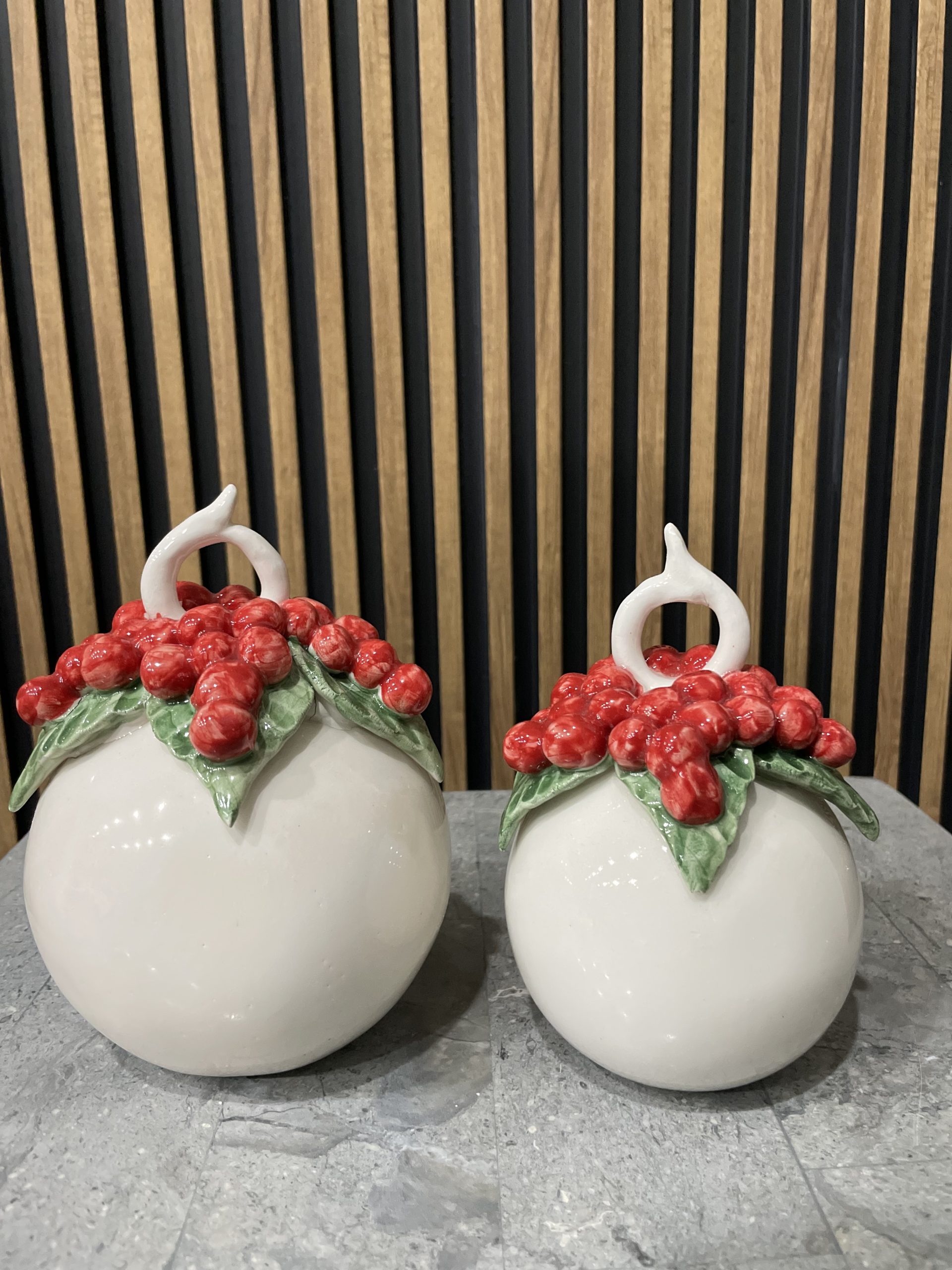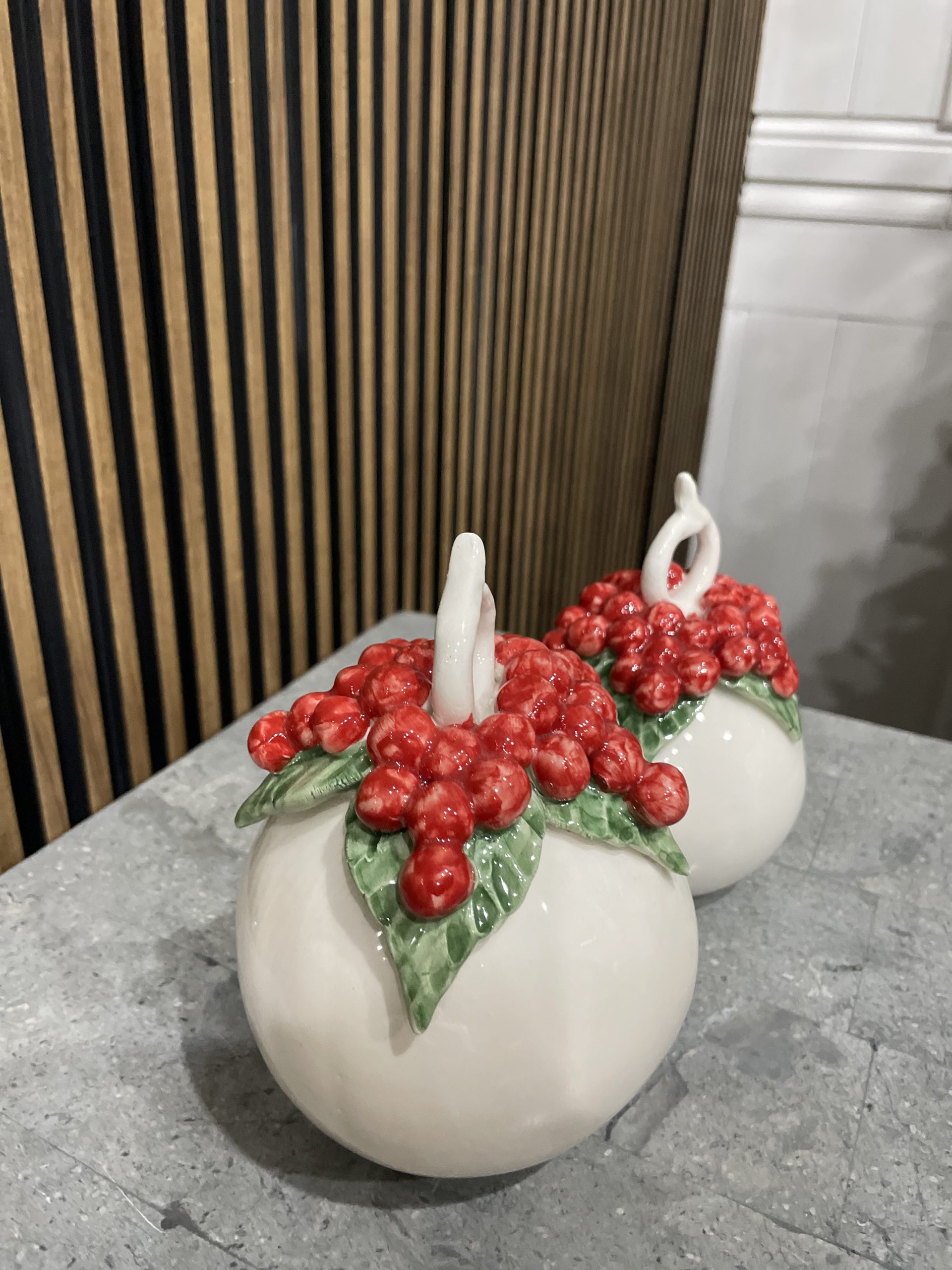 Set due palle interamente in ceramica fatte a mano utilizzabili sia d’appoggio per addobbare la tavola sia per appenderle all’albero