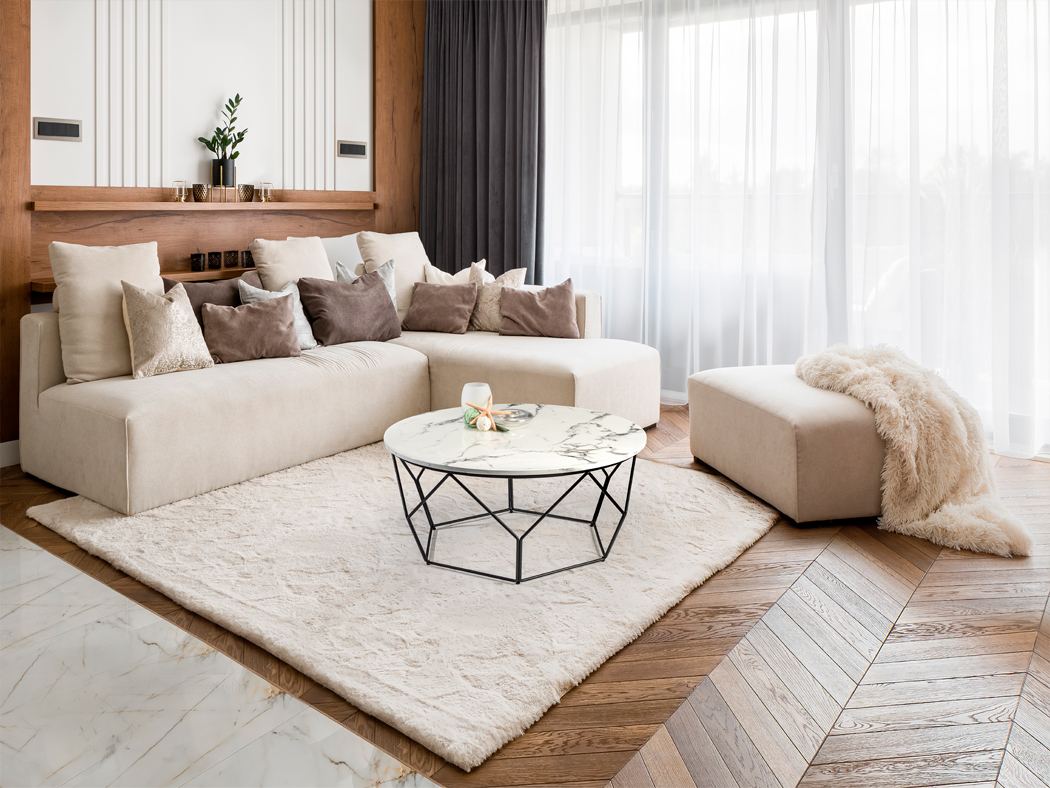Piano tavolino di pietra artificiale rifinita in marmo bianco venato.